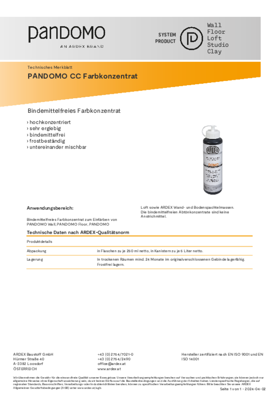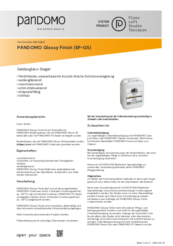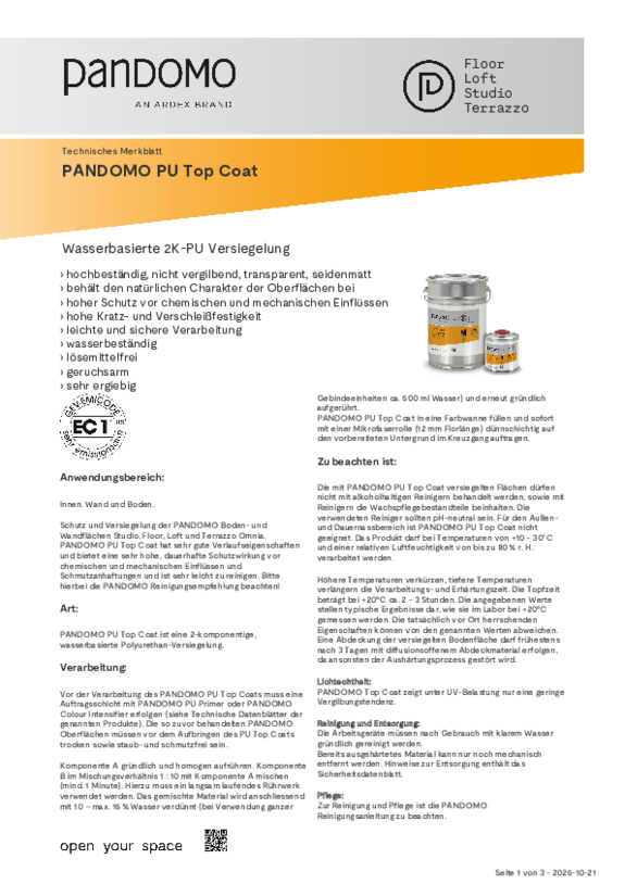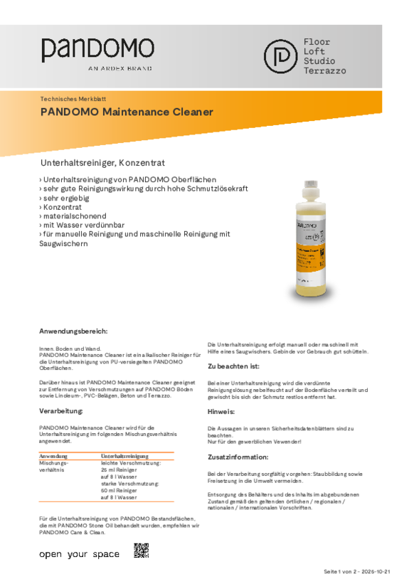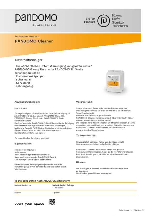 PANDOMO Oberflächen sind sehr widerstandsfähig und leicht zu reinigen. Eine Reinigung mit Neutralreinigern ist jederzeit möglich. Stehende Flüssigkeiten sollten sofort aufgenommen werden. PANDOMO bietet auch eigene Reinigungsprodukte an. Für detaillierte Informationen laden Sie unsere Reinigungsbroschüre herunter.
