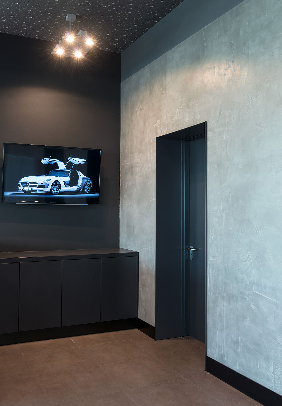 Erzielt wurde diese individuelle Wandgestaltung durch eine spezielle Verarbeitungstechnik: PANDOMO Wall wird hier immer "frisch in frisch" verarbeitet um Ansätze auf der großen Fläche zu vermeiden. Nach ca. einstündiger Trocknungszeit wurden im zweiten Arbeitsschritt die Oberfläche wieder leicht befeuchtet und anschließend die entstandene Zementschlämme mit einer Stuckkelle sorgfältig verpresst. Die einzelnen Kellenschwünge blieben dabei bewusst erhalten. Sie verleihen der Wand die gewünschte ganz individuelle Handschrift. Zum Abschluss wurden die Wandflächen mit einem Exzenterschleifer glatt poliert, bis sich der gewünschte seidig edle Oberflächenglanz mit seiner speziellen Haptik zeigte. So schufen die Verarbeiter innerhalb von nur zwei Tagen, wirtschaftlich effizient, ein höchst individuelles und qualitativ hochwertiges Ergebnis