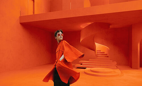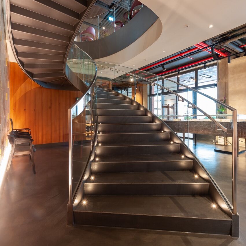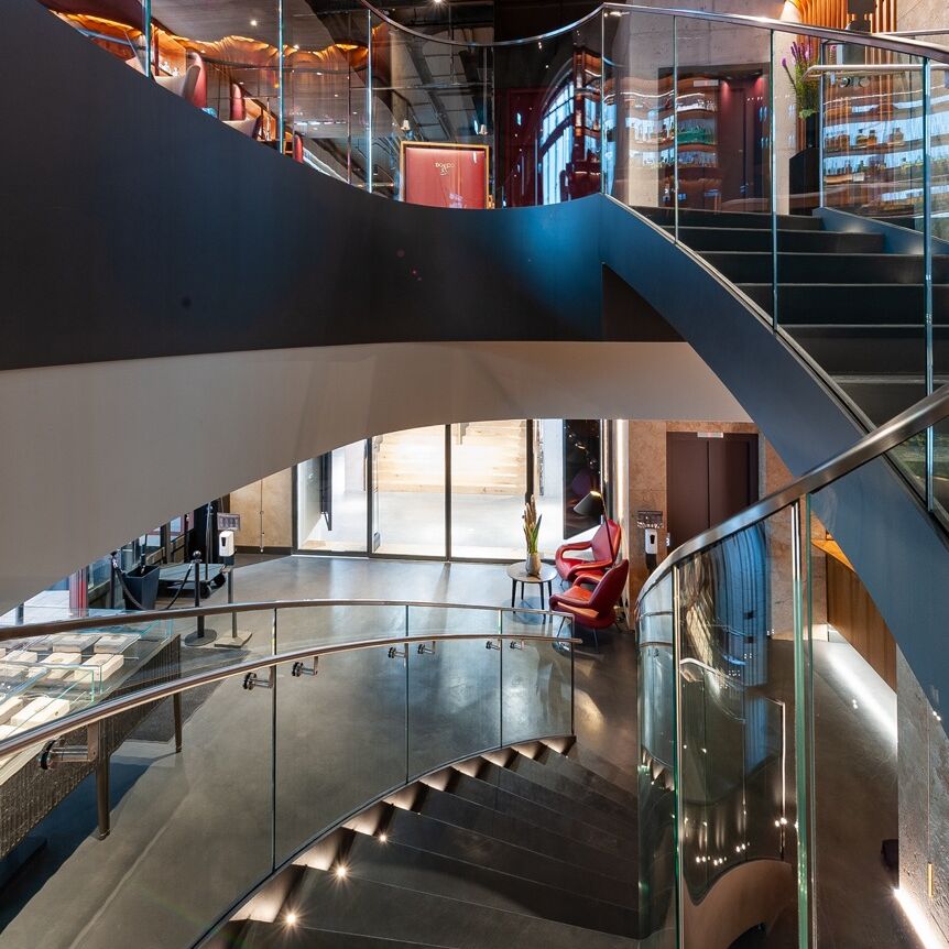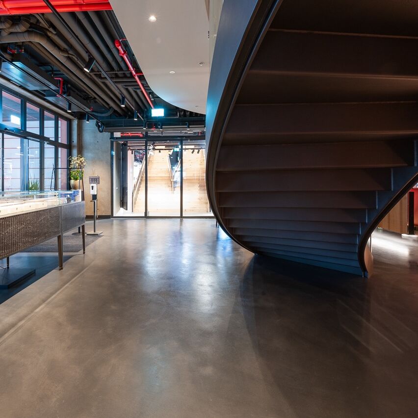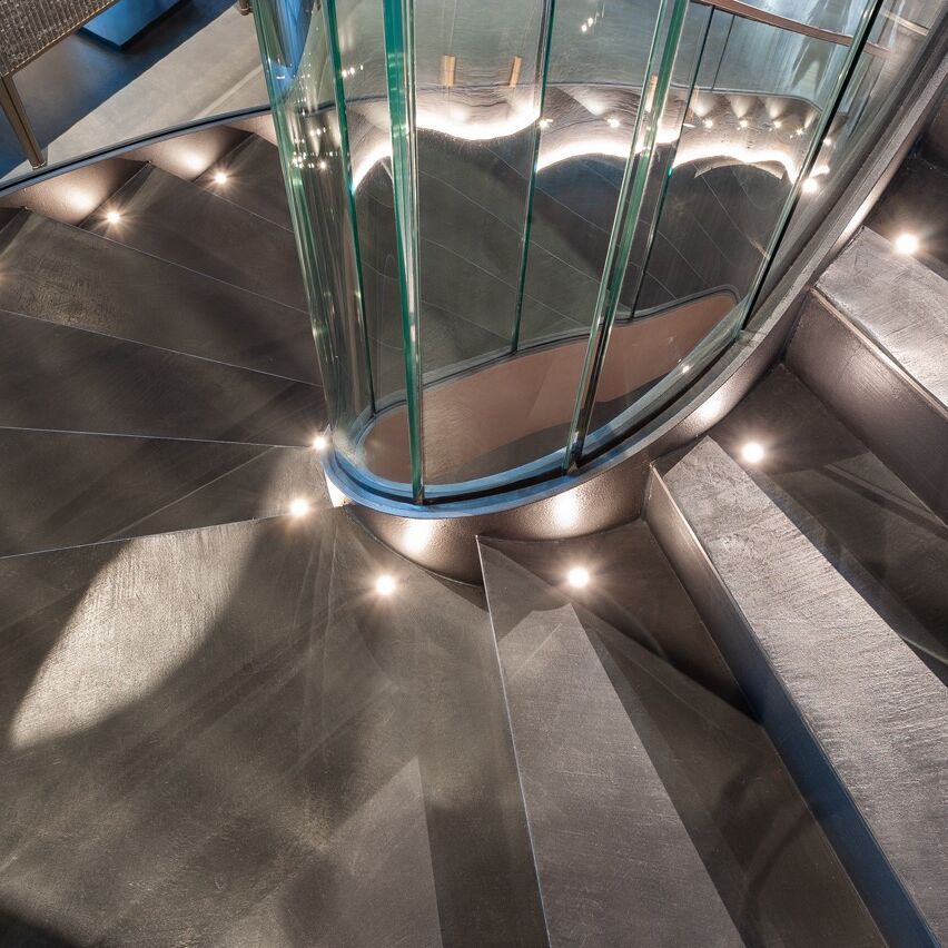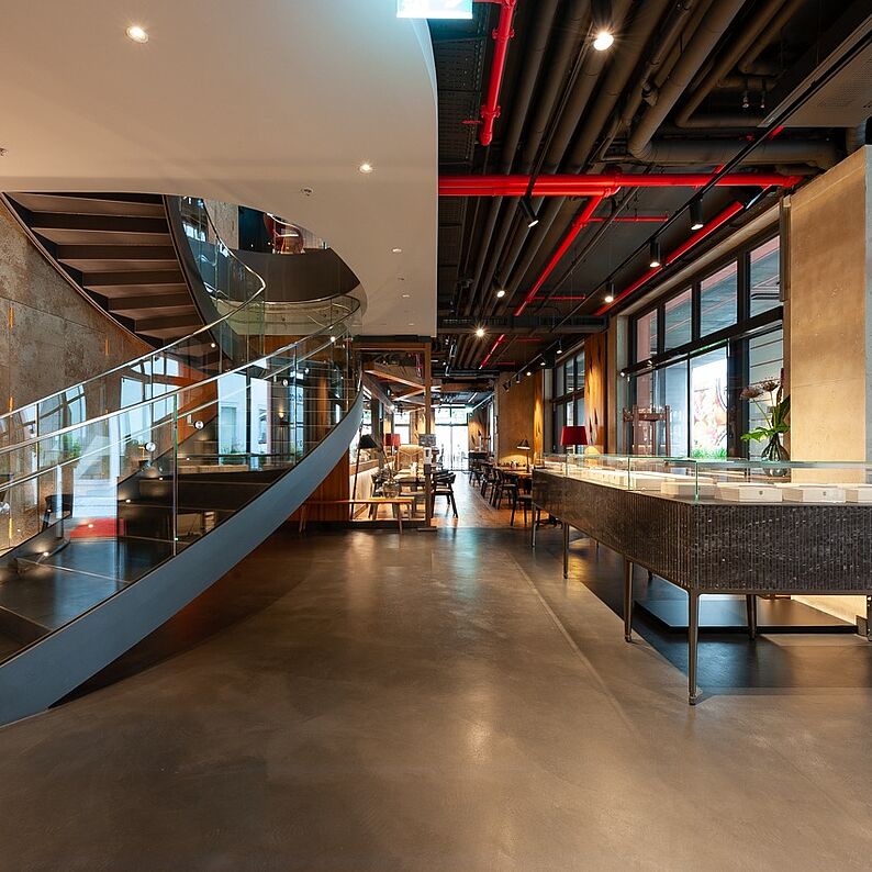 Die Bodenfläche, sowie die imposante Stahlstiege wurde mit PANDOMO Studio 2020 ausgeführt.