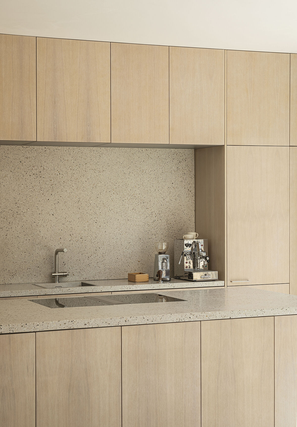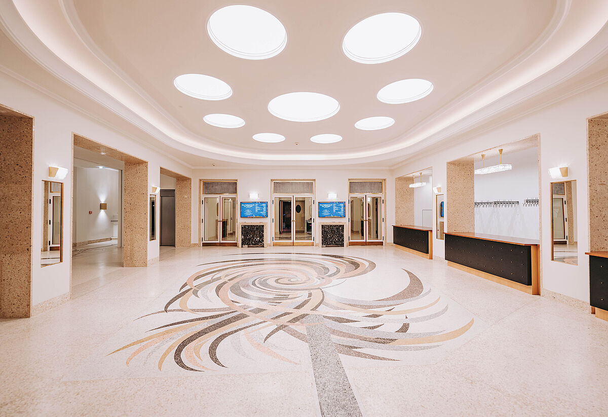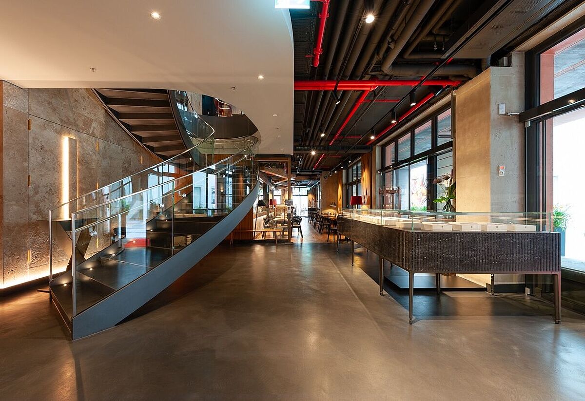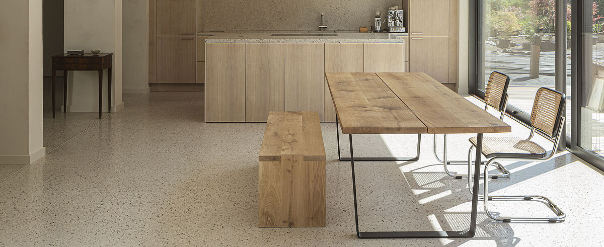 Daher verwendet er in seinen Projekten gern langlebige, hochwertige Materialien, wie PANDOMO Terrazzo. Durch die regionalen Zuschlagsstoffe, wie z.B. Rheinkies mit Frankfurter Quarz, wirken Terrazzo-Oberflächen von Natur aus lebendig, besonders wenn das Licht auf sie fällt.