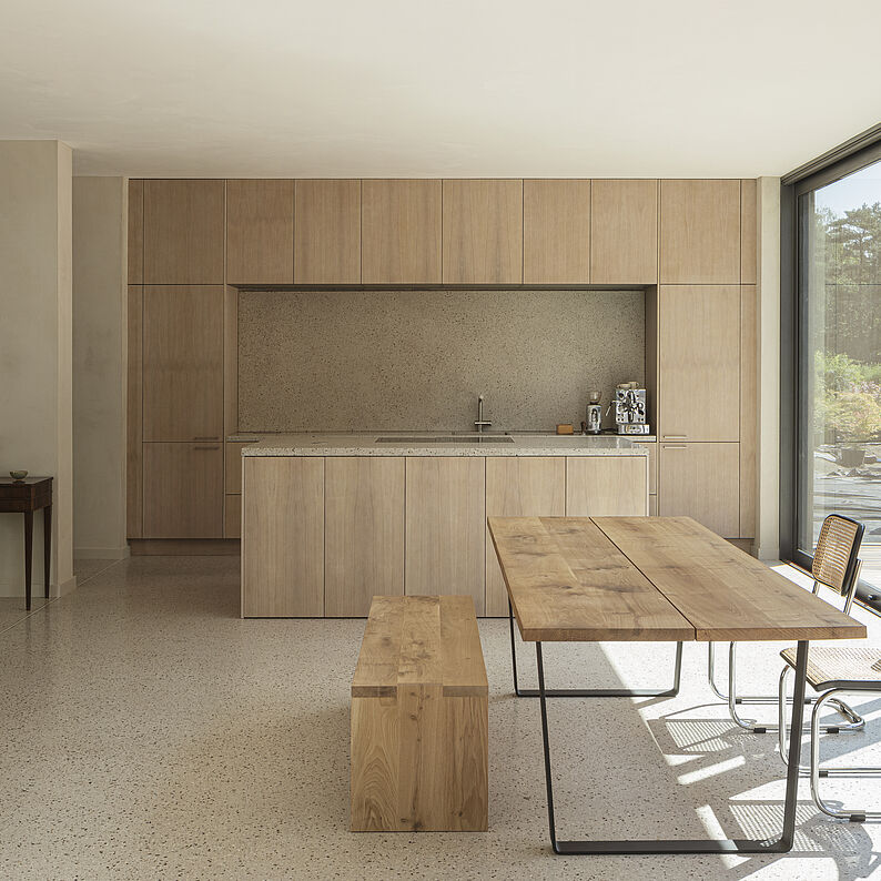 Thomas Kröger, Architekt und Professor für Baukunst an der Kunstakademie Düsseldorf entwirft Häuser als Gesamtkunstwerke – mit einer besonderen Leidenschaft für die Gestaltung der Innenräume. Durch seine Sensibilität für Materialien entwirft er Räume, die über die Oberflächen eine Atmosphäre erzeugen und fast schon erzählerisch wirken. Details, wie die sinnliche Erfahrung der Oberflächen, z.B. des Bodenbelags im Licht, sorgen dafür, dass sich der Bewohner im Haus wohlfühlt.