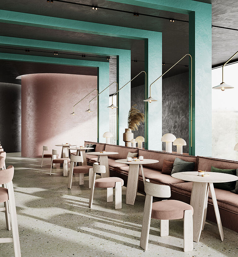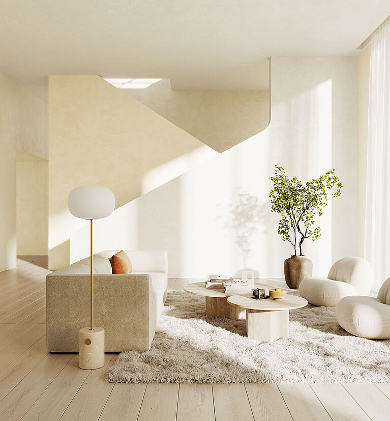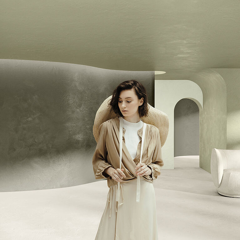 Wand- und Deckenflächen mit dem nachhaltigen Mineralputz PANDOMO Clay wirken feuchtigkeitsregulierend und unterstützen so die Kreation eines angenehmen, ausgeglichenen Raumklimas.